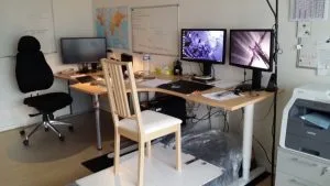 - a desk mounted on an electric actuator purchased from Ikea in order to be able to work seated with the same PC,